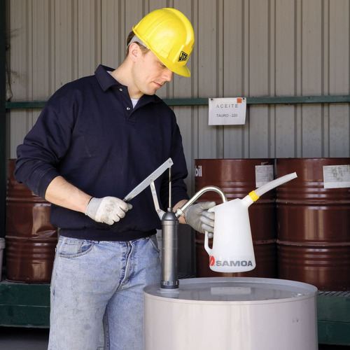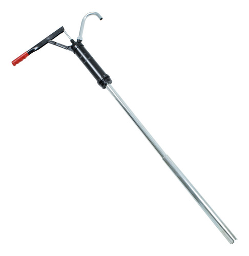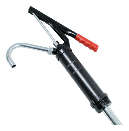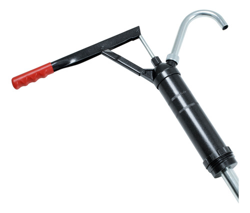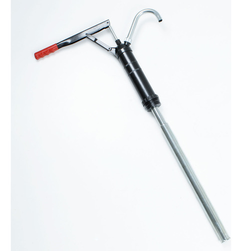 Bomba de accionamiento a palanca para transvasar refrigerantes de motor, alcoholes, desengrasantes, disolventes y aceites desde bidones de 60 o 205 l. Cuerpo de bomba y tubo de aspiración telescópico de acero, cabezal de aluminio, pistón de acero con segmentos de bronce y juntas de Viton®. Conexión a bidón 2″ BSP (M). Entrega 0,45 l por ciclo (16 l/min).