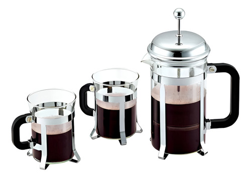 La cafetera Rennes 600ml posee una magnífica prensa de acero inoxidable que combina con su tapa exterior del mismo material e interior de PP, al igual que la manilla. El cuerpo es de vidrio. Shock de temperatura de entre 0°C a 100°C. Apto para el lavavajillas. El set incluye 2 tazas, cada una con una capacidad de 200ml.