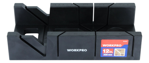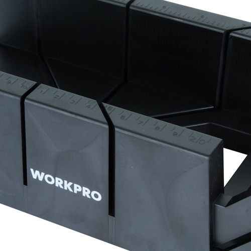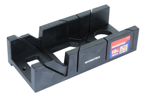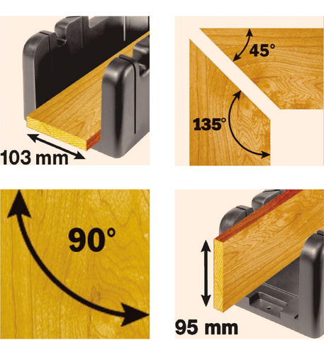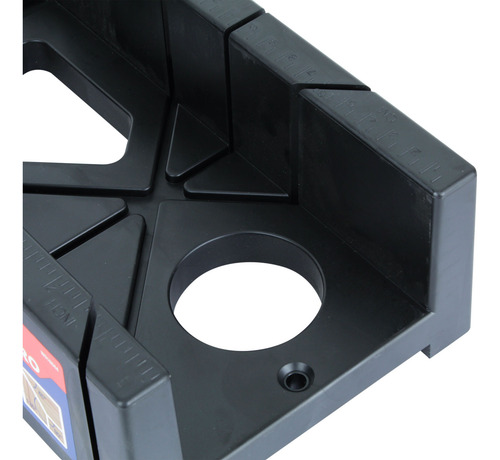 Caja de ingletes, resistente, con dos ranuras avellanadas en la base para fijar al banco. Cuerpo de plástico negro duradero. Ángulos de corte de 45° y 90°