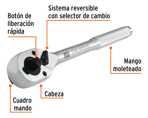 Mecanismo de acero al cromo molibdeno de 72 dientes, que permite apretar o aflojar con un movimiento mínimo en áreas estrechas