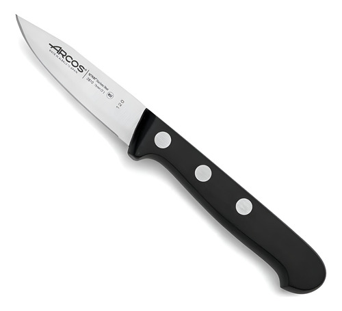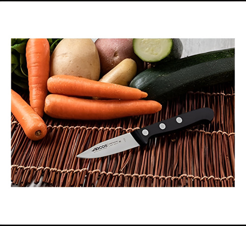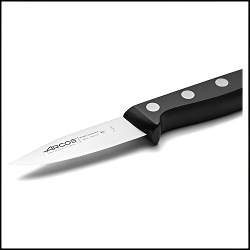 ARCOS, el principal fabricante europeo de cuchillos, presenta la serie Universal, una gama única de cuchillos fabricados 100 por ciento en España desde 1745. Especialmente diseñado para pelar frutas y verduras, el cuchillo pelador Arcos Universal de 3 pulgadas está diseñado pensando en el uso diario. La hoja está fabricada en acero inoxidable NITRUM de alta usabilidad y durabilidad. El mango ergonómico y antideslizante proporciona un agarre firme y cómodo. Las básculas con mango están fabricadas en polioximetileno (POM) y son altamente resistentes al impacto, la abrasión y los disolventes. Los remaches están hechos de una aleación especial de acero inoxidable que garantiza una resistencia a la corrosión extremadamente alta. Originalmente Arcos producía cuchillos exclusivamente para el profesional. Debido a su alto poder de corte (más de 100 mm) y larga retención del filo (más de 350 mm) que convirtieron a los cuchillos Arcos en líderes en el mercado comercial, ahora los cuchillos Arcos también están disponibles para el usuario final que quiere sentir en sus manos un corte preciso, herramienta utilizada por chefs profesionales en todo el mundo.