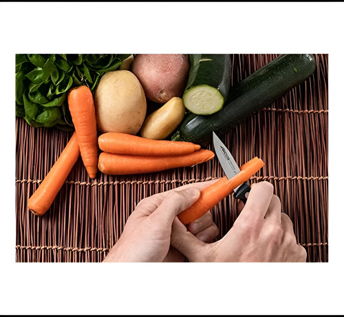 • El cuchillo pelador serie Universal de 75 mm es un utensilio ideal para limpiar, cortar y picar verduras o frutas. Proporciona un corte firme y suave que se adapta perfectamente a tu mano mientras picas, rebanas o cortas cualquier tipo de verdura o fruta.