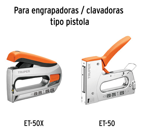 CARACTERISTICAS: Compatible con el modelo ET-50 de Truper Corona: 10.7 mm (27/64″) Largo: 1/2″ Espesor: 0.6 mm Dureza: 27 HRc Empaque individual: Caja con 1000 pzas