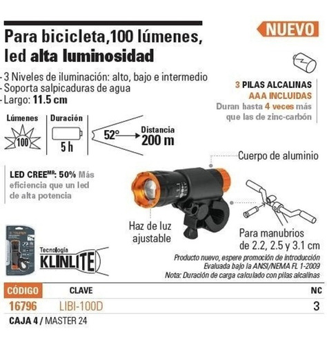 Luminosidad: 100 lm (alto), 26 lm (bajo)